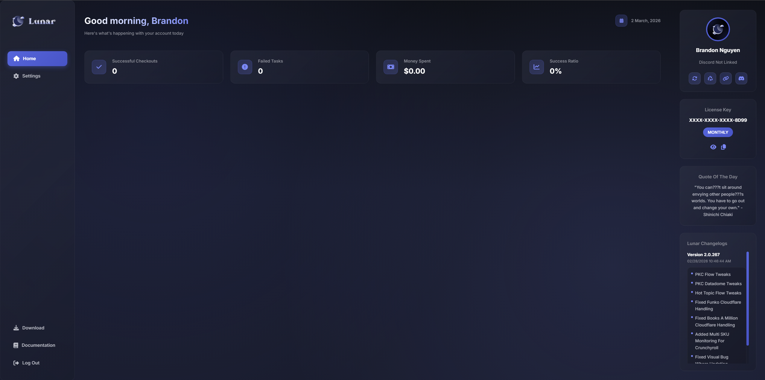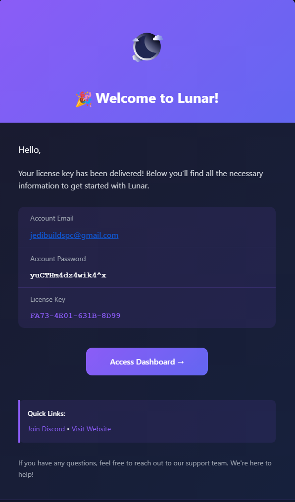 After purchasing Lunar, your key will be automatically delivered to the email you used to purchase, which will be from noreply@lunaraio.com. After locating this email, you will see your key, as well as your dashboard credentials.